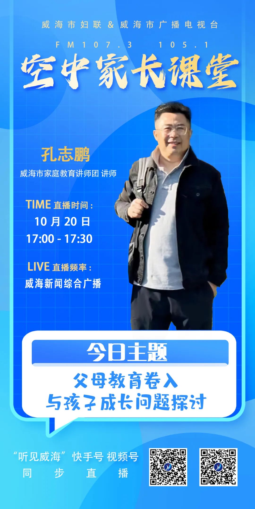 广大家长朋友们!10月20日17:00—17:30,让我们相聚威海新闻综合广播FM 107.3 105.1或“听见威海”快手号、视频号直播间,一起学家庭教育,做智慧父母!节目将于10月21日—22日每天10:00,10月23日—26日每天19:00在威海新闻综合广播FM 107.3 105.1重播,欢迎关注。