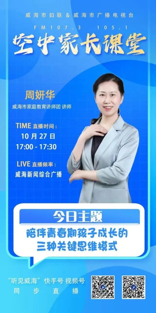 广大家长朋友们!10月27日17:00—17:30,让我们相聚威海新闻综合广播FM 107.3 105.1或“听见威海”快手号、视频号直播间,一起学家庭教育,做智慧父母!节目将于10月28日—29日每天10:00,10月30日—11月2日每天19:00在威海新闻综合广播FM 107.3 105.1重播,欢迎关注。