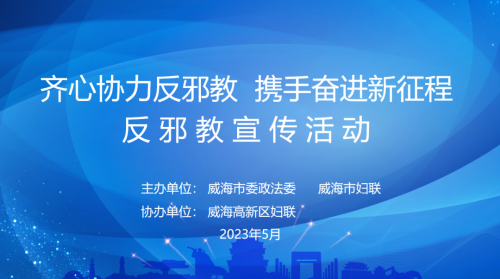 5月8日,市委政法委和市妇联共同举办“齐心协力反邪教 携手奋进新征程”反邪教宣传活动,活动通过线上线下联动方式向广大群众宣传邪教的本质和社会危害,介绍如何防范和抵御邪教,构建全民抵御邪教的思想屏障,营造全社会“崇尚科学 反对邪教”的良好氛围,助力法治威海建设。
