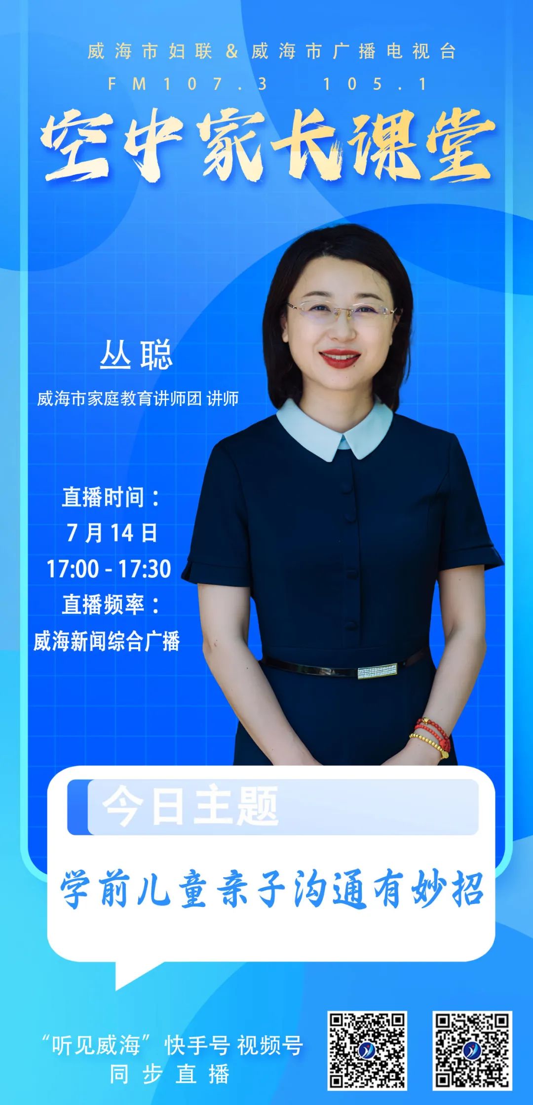 广大家长朋友们!7月14日17:00—17:30,让我们相聚威海新闻综合广播FM 107.3 105.1或“听见威海”快手号、视频号直播间,一起学家庭教育,做智慧父母!节目将于7月15日—16日每天10:00,7月17日—20日每天19:00在威海新闻综合广播FM 107.3 105.1重播,欢迎关注。
