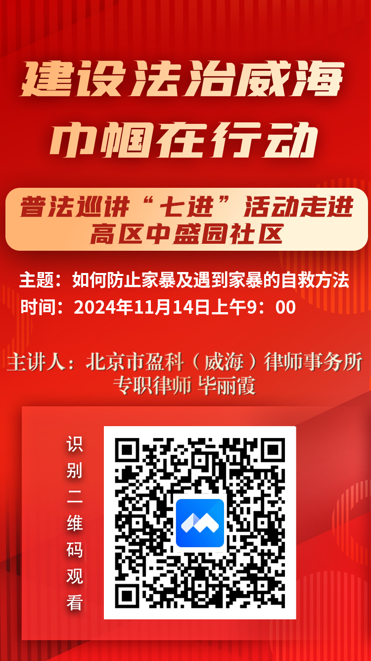 本期活动将邀请北京市盈科(威海)律师事务所专职律师毕丽霞,走进高区中盛园社区,围绕如何防止家暴及遇到家暴的自救方法,面向社区群众开展普法宣讲活动。普法巡讲活动将通过腾讯会议进行同步直播,11月14日(周四)9:00,邀您收看!