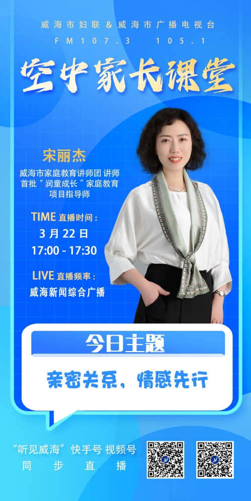 广大家长朋友们!3月22日17:00—17:30,让我们相聚威海新闻综合广播FM 107.3 105.1或“听见威海”快手号、视频号直播间,一起学家庭教育,做智慧父母!节目将于3月23日—3月24日每天10:00,3月25日—3月28日每天19:00在威海新闻综合广播FM 107.3 105.1重播,欢迎关注。