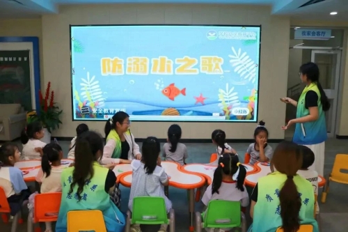 活动最后,志愿者们还通过为小朋友们播放防溺水儿歌,来加深小朋友们对防溺水知识的印象。志愿者边唱着儿歌边搭配着简单的肢体动作,在欢乐的儿歌中,此次防溺水“沉浸式”学习体验活动也圆满结束了。