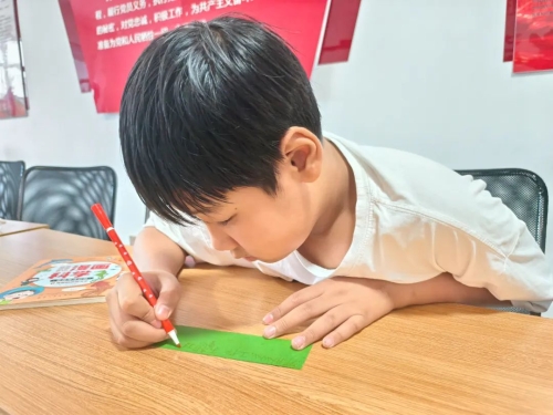 随后,社区为孩子们发放了色彩鲜艳的安全生产亲情卡和卡通贴纸。拿到卡片的孩子们立刻投入创作:有的用彩笔画出安全帽和安全带,旁边歪歪扭扭写着“爸爸上班要戴好”;有的贴上“禁止吸烟”的贴纸,配上“妈妈在厨房要注意防火”的字样;还有的画上一个大大的爱心,里面写着“希望爸爸妈妈每天都平平安安回家”。简单的图画和文字,满是孩子们对父母最真挚的牵挂。