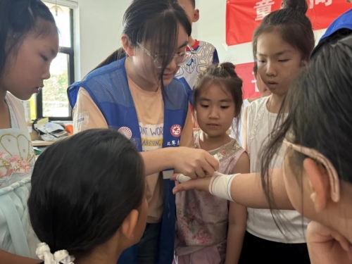 魏桥社区联合齐鲁师范学院经济与管理学院大学生志愿者以“护苗行动,应急护航”为主题,通过沉浸式场景教学,为辖区儿童带来消防安全、防溺水自救、急救技能等实用课程,以“理论+实操”的创新模式点亮儿童安全成长之路。