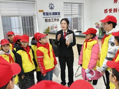 活动伊始,同学们怀着好奇与崇敬的心情,在法院干警的引导下有序通过安检区。一进到诉讼服务大厅,温馨便捷的便民服务设施瞬间吸引了大家的目光,干警们结合具体场景,生动讲解了诉讼引导、立案登记、纠纷调解等服务流程。针对成长过程中可能遇到的校园欺凌、未成年人保护等热点问题,选取典型案例,用通俗易懂的语言剖析法律知识,将抽象的法律条文转化为贴近校园生活的生动故事。讲解过程中,孩子们时而若有所思地点头,时而主动举手提问,浓厚的学习兴趣被充分激发。