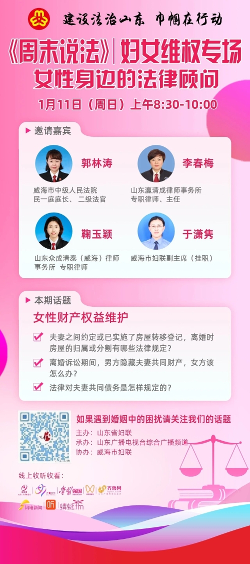 1月11日上午,威海市妇女维权法律服务团成员郭林涛、李春梅、鞠玉颖与威海市妇联副主席于潇隽(挂职)将应邀做客山东广播电视台综合广播频道《周末说法》栏目,聚焦女性财产权益维护问题,现场为大家答疑解惑。