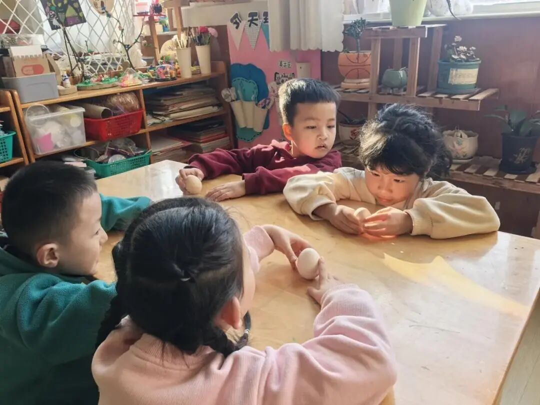 活动伊始,“节气老师”用生动有趣的儿歌、浅显易懂的讲解,向孩子们介绍了春分的节气特点----昼夜平分、万物复苏,还有流传了4000多年的立蛋习俗的由来与寓意。孩子们睁着好奇的大眼睛,认真聆听着古人顺应天时、庆贺春回大地的智慧。