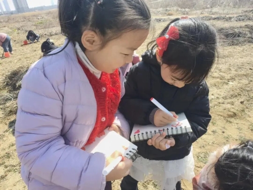 活动现场暖意融融,除了室内的立蛋、画蛋、说春分,孩子们还走进户外,踏着春日的暖阳,寻找春菜的身影,孩子们辨认春菜、挖掘春菜,亲手触摸嫩绿的菜叶,感受泥土的芬芳,真切体会“春食芽、尝春味”的节气习俗,近距离感受春回大地的生机与活力。